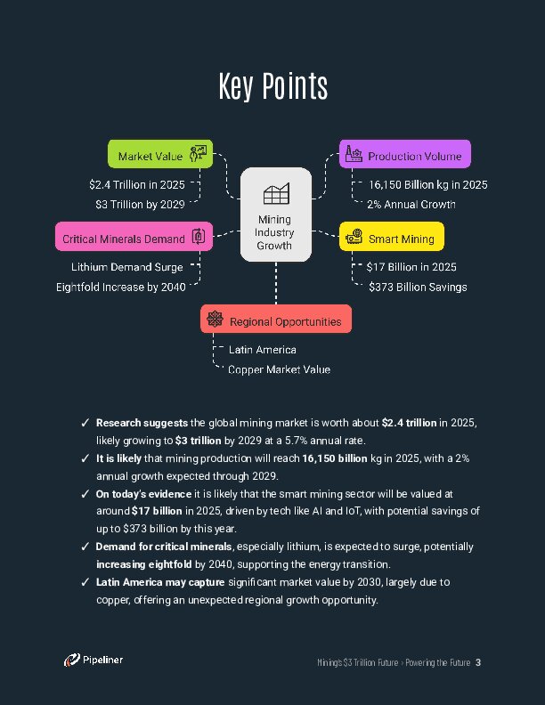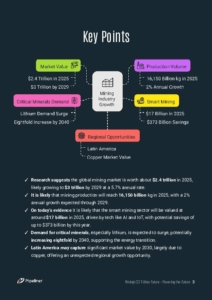 The mining sector is poised for significant expansion, projected to reach a staggering $3 trillion by 2029. Our comprehensive whitepaper, “Mining’s $3 Trillion Future › Powering the Future,” offers vital insights into this evolving landscape and its opportunities.