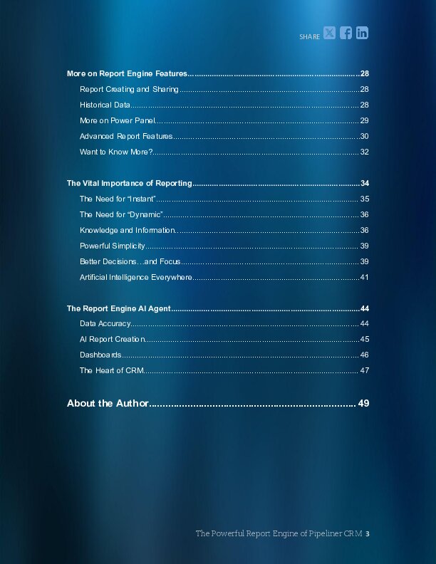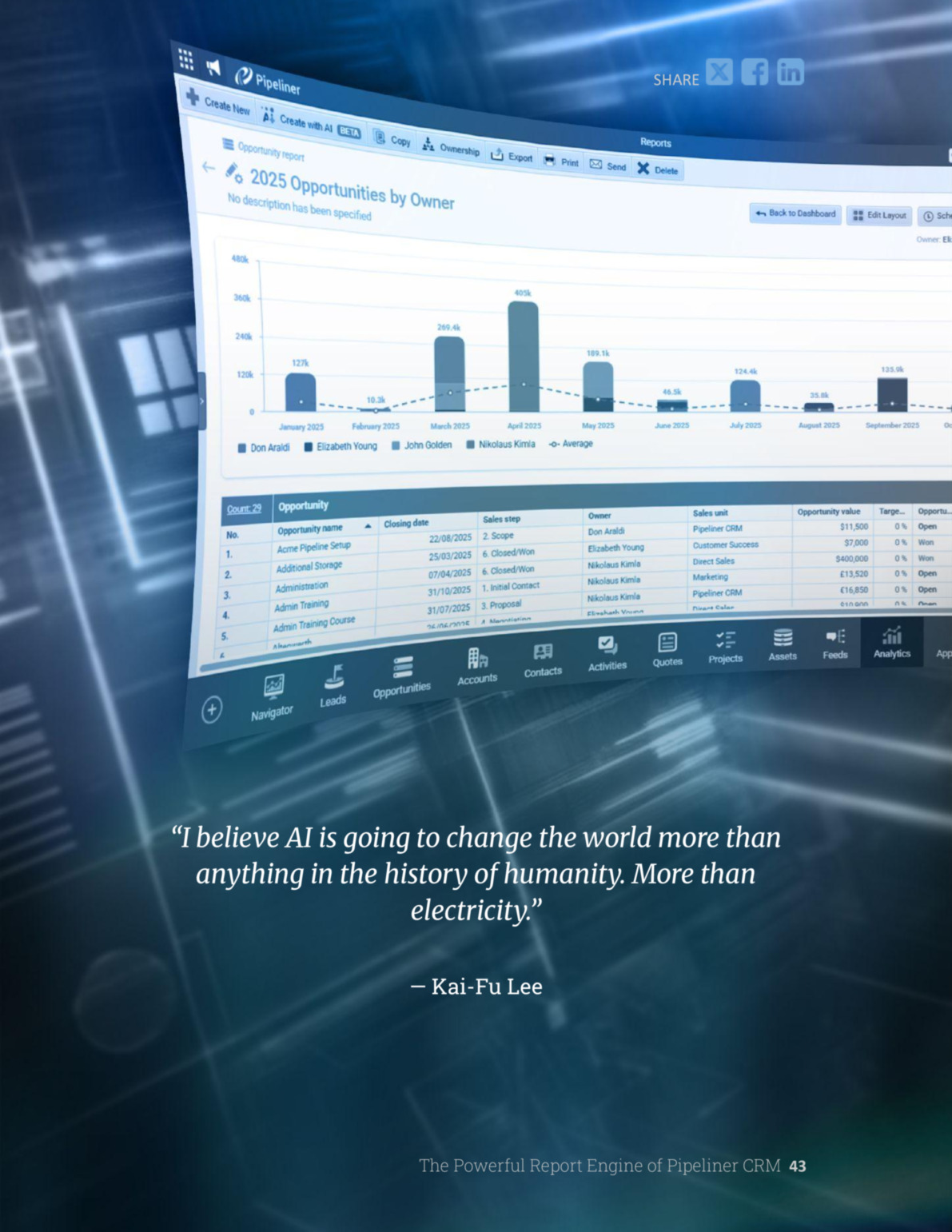 The ebook concludes with a look at the future of reporting: artificial intelligence. Pipeliner has released its first effective AI agent for the Report Engine, which makes creating reports as simple as typing or speaking your instructions. However, Kimla strongly emphasizes that AI is only valid if your data is accurate and clean. This is why Pipeliner provides a “Duplicate Checker” to ensure meaningful results. The reports generated by the AI agent can be easily added to Pipeliner’s powerful dashboards, giving sales management a comprehensive overview of the company’s operations.