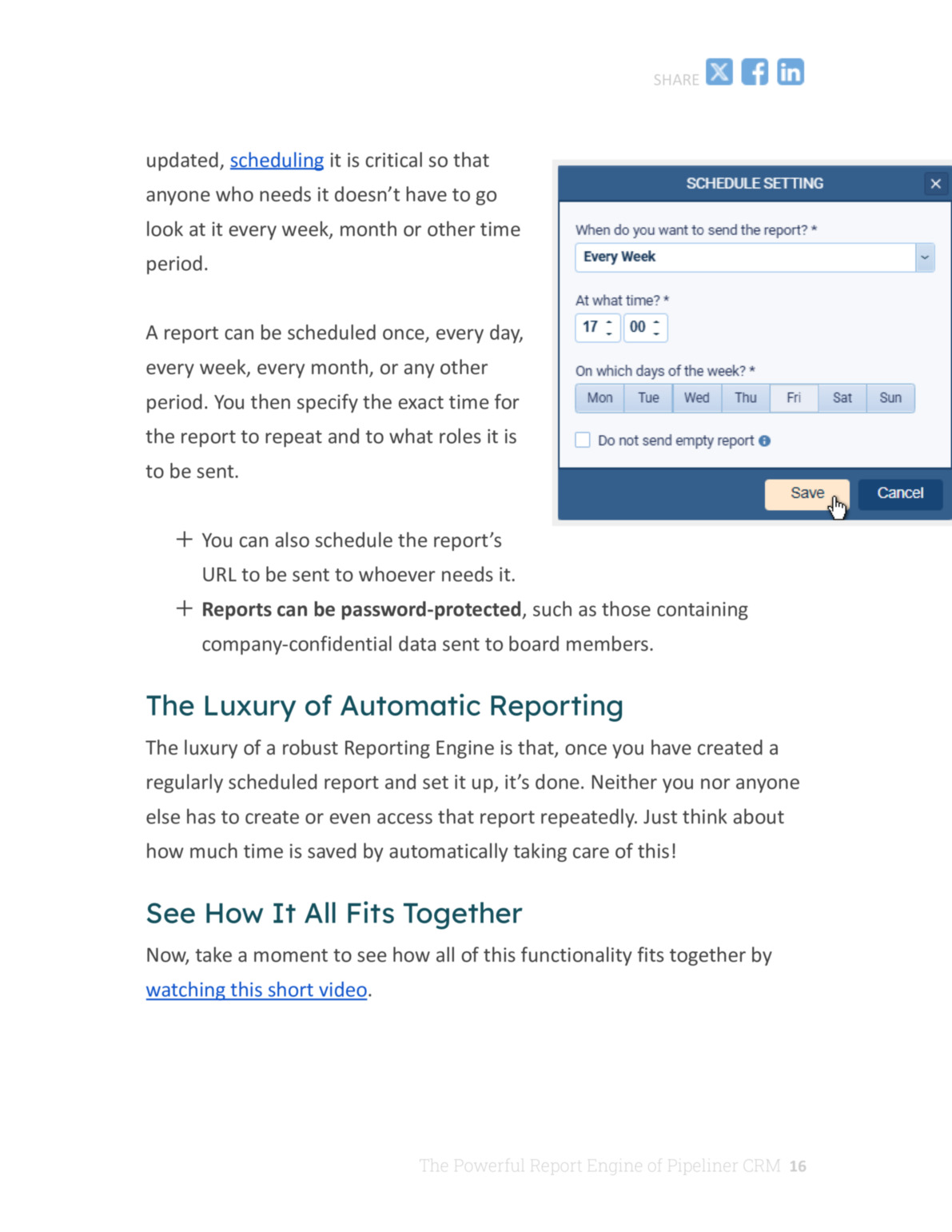 Pipeliner’s user-friendly design allows you to create reports from any of its entities—such as an Account, Contact, or Opportunity—which is a significant departure from other CRM systems. The “Power Panel” is a central feature that allows you to modify report views easily, set access permissions (private, public, or custom), and apply filters. Pipeliner also offers a wide range of chart visualizations, including line graphs, bar charts, pie charts, and stacked bar charts, to make data instantly understandable. Another powerful feature is “Report Scheduling,” which automates the process of sending reports regularly, saving valuable time.