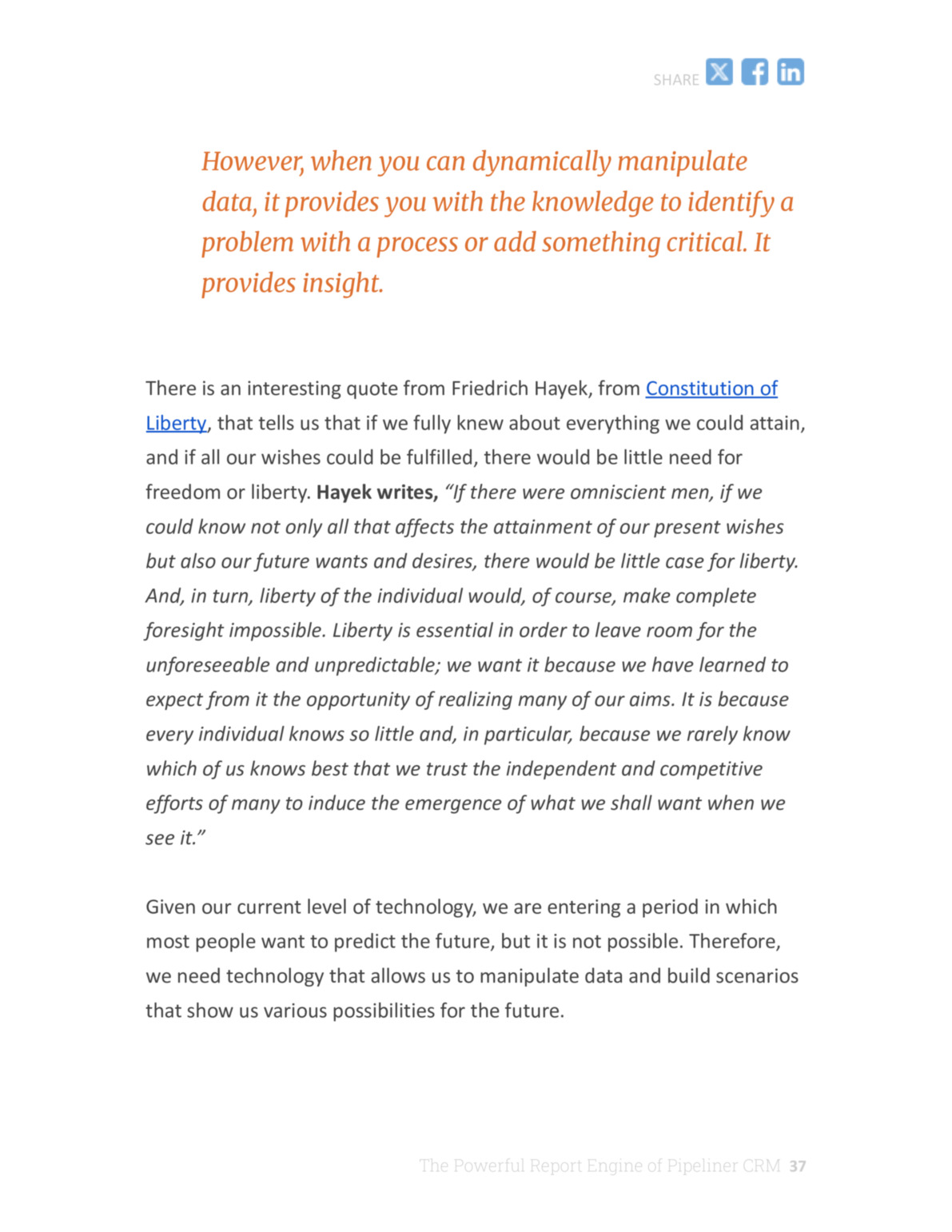 The ebook explores how Pipeliner CRM has expanded far beyond a traditional “point solution”. This has created a new, critical role within companies—one that is responsible for connecting processes across different departments, including sales, marketing, finance, and product development. Kimla uses the analogy of Johann Strauss’s “Blue Danube Waltz” to illustrate the ideal of a smooth, seamless flow of data between departments. This new role is vital for a company to survive in today’s competitive environment, and Pipeliner offers to educate individuals for this position at no cost.