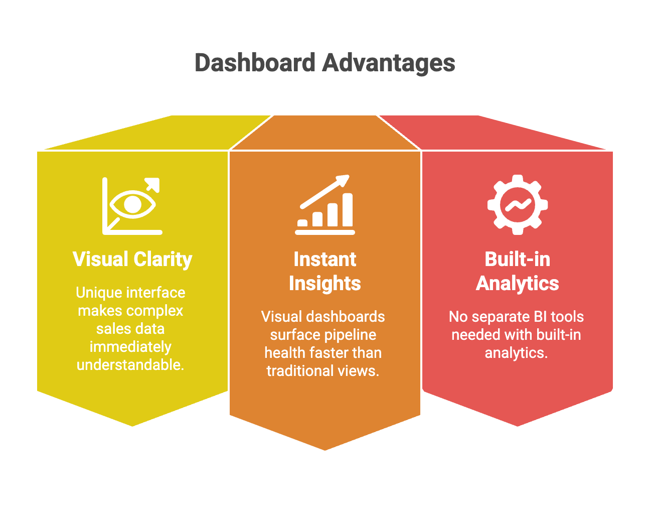 Sellers already spend most of their time in the CRM, so having dashboards on the same platform provides holistic views without extra effort. Native dashboards eliminate manual, time-consuming data export processes. Data remains current versus static exported spreadsheets that become outdated immediately.